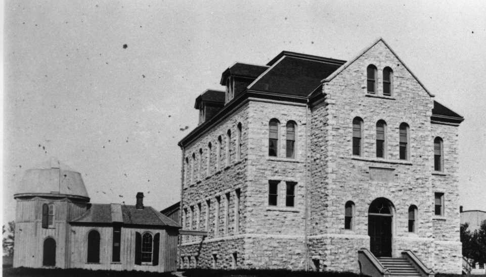 A student of that year recalls that the professor was James Williamson, then 50 years on the Queen's staff and in the eyes of the students very old, very absent minded, but highly revered. The lectures were given in a small frame building in the rear of the present Carruthers Hall. A stove provided inadequate heat, but the professor wore two overcoats and one muffler about his neck and one around his waist! One of his students, S. A. Mitchell took his M.A. in 1894, became a professional astronomer, and in later years was widely known in his position as the Director of Leander McCormick Observatory in Virginia, U.S.A.
