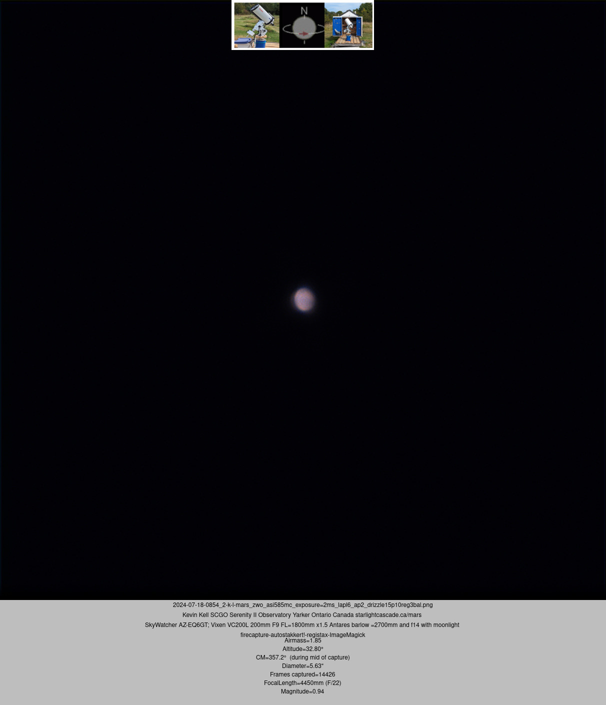 FireCapture v2.7.14 Settings ------------------------------------ Observer=kk Location=yarker ontario canada Scope=vixenvc200L Camera=ZWO ASI585MC Filter=L Profile=Mars Diameter=5.63" Magnitude=0.94 Altitude=32.80° Airmass=1.85 CM=357.2° (during mid of capture) FocalLength=4450mm (F/22) Resolution=0.13" Filename=2024-07-18-0854_2-k-L-Mars_ZWO ASI585MC_Exposure=2.1ms.ser Date=20240718 Date(UT)=20240718 Start=045247.512 Mid=045417.515 End=045547.519 Start(UT)=085247.512 Mid(UT)=085417.515 End(UT)=085547.519 Duration=180.007s Date_format=yyyyMMdd Time_format=HHmmss LT=UT Frames captured=14426 FPS (avg.)=80 File type=SER Binning=1x1 Bit depth=8bit Data=RAW Debayer(Preview)=yes Debayer(Data)=no (RAW) Debayer(Algorithm)=NearestNeighbor Debayer(Pattern)=RG ROI=808x806 ROI(Offset)=1536x648 Shutter=2.069ms Gain=452 (75%) AutoExp=off AutoGain=off Brightness=1 Gamma=50 HardwBin=off HighSpeed=off USBTraffic=100 WBlue=75 WRed=55 Histogramm(min)=0 Histogramm(max)=61 Histogramm=23% Noise(avg.deviation)=1.41 eADU=0.062 AutoAlign=true PreFilter=none Limit=180 Seconds Sensor temperature=25.5°C |